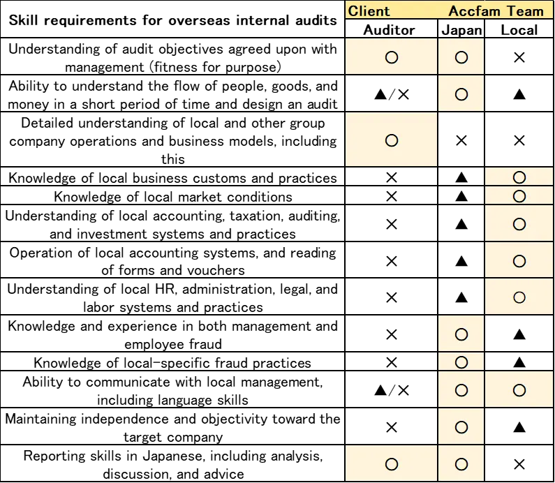 For crossborder internal audits/investigations, we recommend a three-way approach (co-sourcing) involving the company’s in-house staff who understand the target company’s business, our Japanese experts, and local experts. We have organized the requirements for effective overseas audits and who has them based on our extensive experience in this area, as shown in the table below.