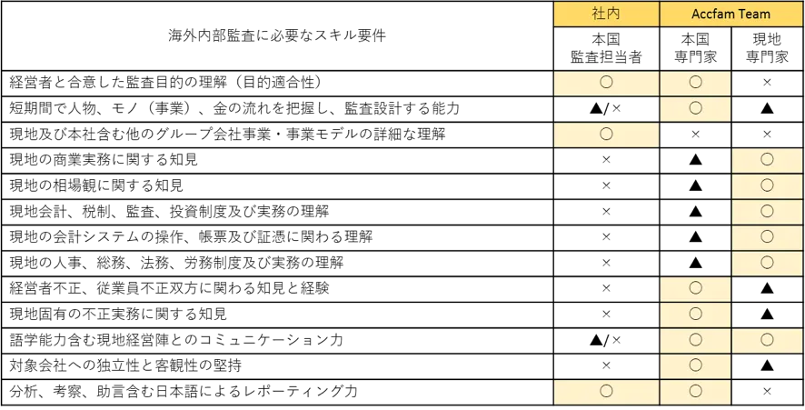 アクファムの海外内部監査/調査は、対象会社の事業を理解されている企業側担当者様と、弊社日本人専門家及び現地専門家の三者による実施(コソーシング)を推奨しています。有効な海外監査に必要な要件は何であって、それは誰が持ち合わせているのか、豊富な案件実績の中から、私たちは下表のように整理しています。